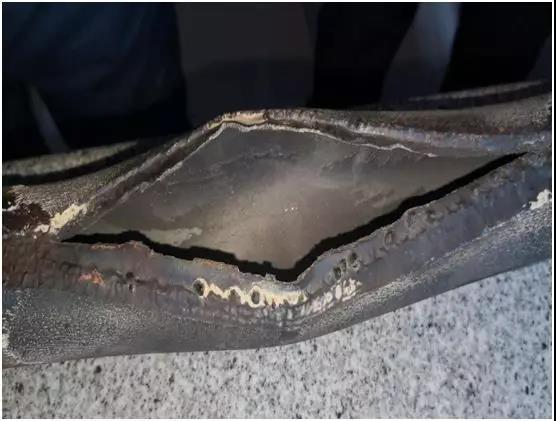 經(jīng)過(guò)檢查后發(fā)現(xiàn),造成本次事故的原因是過(guò)熱器爆管。流過(guò)熱器低溫段左側(cè)第二屏前向后數(shù)第三根管爆管,爆口距頂棚約4米,爆口外表面有長(zhǎng)約200mm、寬約10mm溝痕,厚度1mm溝痕,斷口大部分壁厚小于1毫米。斷管后進(jìn)行通球未發(fā)現(xiàn)異物,調(diào)取2018年10月9日1號(hào)機(jī)組啟動(dòng)以來(lái)壁溫及煙溫曲線,未發(fā)現(xiàn)超溫情況,該管段附近無(wú)吹灰器(排除吹灰器吹損原因)。由于管子爆口下部管段存在明顯減薄缺陷,且原因不清,為進(jìn)一步分析查明爆管及管子減薄缺陷的形成原因,2月18日,將爆管管樣寄至熱工院進(jìn)行檢測(cè)分析。