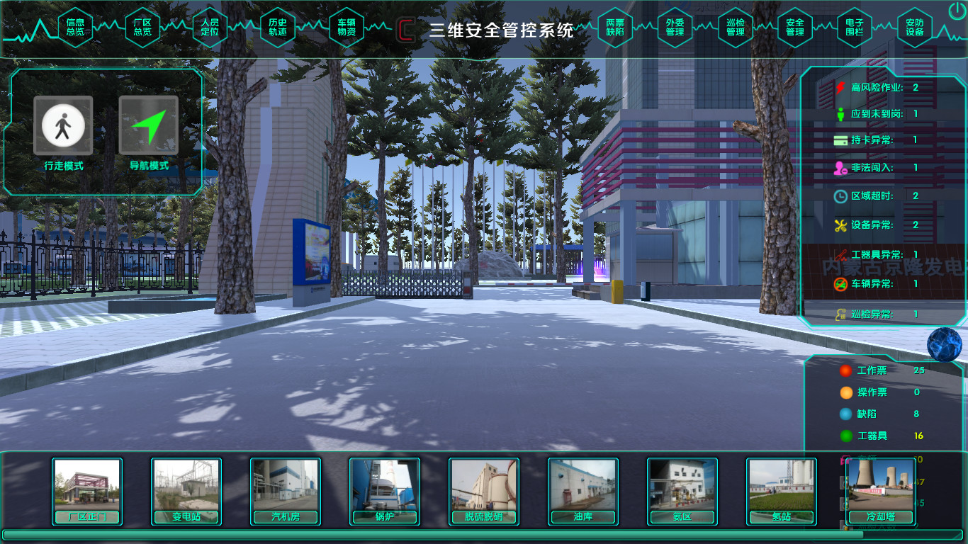 系統(tǒng)把整個廠區(qū)劃分為N個作業(yè)區(qū)域,根據(jù)作業(yè)區(qū)域安全風(fēng)險的高低做出相應(yīng)的等級劃分,便于重點區(qū)域重點監(jiān)控。根據(jù)各人員的工作崗位和工作內(nèi)容進(jìn)行區(qū)域授權(quán),對人員闖入未授權(quán)區(qū)域系統(tǒng)立即報警。同時系統(tǒng)會接入ERP中的兩票、缺陷信息,根據(jù)兩票、缺陷信息中的區(qū)域位置及設(shè)備的KKS編碼,把兩票、缺陷作業(yè)劃分到相應(yīng)的區(qū)域中,實現(xiàn)兩票、缺陷及作業(yè)人員分區(qū)域列表展現(xiàn)和三維展現(xiàn),方便查看與管理。定位系統(tǒng)自動記錄巡點檢人員的巡點檢時長、巡點檢次數(shù)并與預(yù)設(shè)的巡點檢路線進(jìn)行比對,自動統(tǒng)計分析巡點檢人員的到位率與偏差等。對于巡點檢人員偏離巡點檢路線及漏檢等及時短信與APP推送報警信息。密閉空間作業(yè)屬于高風(fēng)險作業(yè),安全風(fēng)險較高。針對密閉空間作業(yè)的環(huán)境特點,采用電池供電的移動式定位設(shè)備臨時固定在密閉空間內(nèi),天線放置在密閉空間外,確保定位無線信號傳輸?shù)目煽啃浴?/span>人員攜帶定位標(biāo)簽進(jìn)入密閉空間系統(tǒng)可實時監(jiān)督密閉空間內(nèi)人員數(shù)量。同時可加設(shè)便攜式無線攝像頭,以便實時監(jiān)控作業(yè)人員。高空作業(yè)、大型設(shè)備吊裝及腳手架搭設(shè)過程中容易出現(xiàn)安全事故,如未掛安全帶墜落,交叉作業(yè)、高空落物等風(fēng)險,這類亦屬于高風(fēng)險作業(yè)。在作業(yè)前假設(shè)臨時虛擬電子圍欄,防止無關(guān)人員進(jìn)入工作區(qū),同時利用圖形識別技術(shù)檢測是否正確佩戴安全帽和安全帶,發(fā)現(xiàn)異常立即報警。系統(tǒng)支持接入電廠視頻監(jiān)控系統(tǒng),在三維電子地圖上顯示視頻監(jiān)控位置,任意切換調(diào)取視頻監(jiān)控。可實現(xiàn)快速查找、單點回放、圖像識別等功能。同時可基于人員當(dāng)前位置自動調(diào)取對應(yīng)的視頻監(jiān)控,對人員行走到其他位置自動切換到相應(yīng)監(jiān)控畫面。對于發(fā)生異常的情況,可基于人員歷史軌跡不同位置及不同時段調(diào)取相應(yīng)位置相應(yīng)時間段的歷史視頻監(jiān)控,與歷史軌跡聯(lián)動播放,方便事故分析及責(zé)任劃定。