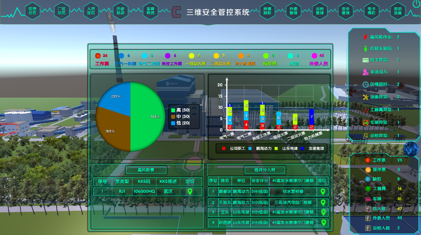 人員安全主要體現(xiàn)在兩點:空間內(nèi)行為安全以及作業(yè)過程安全。空間內(nèi)行為安全的解決辦法應(yīng)用到的就是目前比較熱門的技術(shù):UWB室內(nèi)定位技術(shù)。人員定位技術(shù)之所以能夠在安全管理上起到關(guān)鍵作用,主要在于實時的定位能夠精確定位人員在空間內(nèi)的位置,而UWB技術(shù)的精度可以達到10cm。以云酷科技的三維可視化人員定位管理系統(tǒng)為例,其主要能夠?qū)崿F(xiàn)的功能:員工攜帶信息唯一的定位標(biāo)簽,通過電子標(biāo)簽和定位設(shè)備之間不斷測距,實時定位并顯示在二維/三維地圖上,當(dāng)人員遇到突發(fā)情況時,可以通過電子標(biāo)簽進行報警。同時根據(jù)標(biāo)簽的唯一性,在系統(tǒng)中輸入人員信息就可以查詢當(dāng)前位置,還可以查詢到人員一定時間內(nèi)的歷史活動軌跡。在此基礎(chǔ)之上系統(tǒng)會自動統(tǒng)計各外包隊伍出勤率,及人員出勤天數(shù)供管理人員查看。系統(tǒng)把整個廠區(qū)劃分為N個作業(yè)區(qū)域,根據(jù)作業(yè)區(qū)域安全風(fēng)險的高低做出相應(yīng)的等級劃分,便于重點區(qū)域重點監(jiān)控。根據(jù)各人員的工作崗位和工作內(nèi)容進行區(qū)域授權(quán),對人員闖入未授權(quán)區(qū)域系統(tǒng)立即報警。同時系統(tǒng)會接入ERP中的兩票、缺陷信息,根據(jù)兩票、缺陷信息中的區(qū)域位置及設(shè)備的KKS編碼,把兩票、缺陷作業(yè)劃分到相應(yīng)的區(qū)域中,實現(xiàn)兩票、缺陷及作業(yè)人員分區(qū)域列表展現(xiàn)和三維展現(xiàn),方便查看與管理。定位系統(tǒng)自動記錄巡點檢人員的巡點檢時長、巡點檢次數(shù)并與預(yù)設(shè)的巡點檢路線進行比對,自動統(tǒng)計分析巡點檢人員的到位率與偏差等。對于巡點檢人員偏離巡點檢路線及漏檢等及時短信與APP推送報警信息。密閉空間作業(yè)屬于高風(fēng)險作業(yè),安全風(fēng)險較高。針對密閉空間作業(yè)的環(huán)境特點,采用電池供電的移動式定位設(shè)備臨時固定在密閉空間內(nèi),天線放置在密閉空間外,確保定位無線信號傳輸?shù)目煽啃浴?/span>人員攜帶定位標(biāo)簽進入密閉空間系統(tǒng)可實時監(jiān)督密閉空間內(nèi)人員數(shù)量。同時可加設(shè)便攜式無線攝像頭,以便實時監(jiān)控作業(yè)人員。高空作業(yè)、大型設(shè)備吊裝及腳手架搭設(shè)過程中容易出現(xiàn)安全事故,如未掛安全帶墜落,交叉作業(yè)、高空落物等風(fēng)險,這類亦屬于高風(fēng)險作業(yè)。在作業(yè)前假設(shè)臨時虛擬電子圍欄,防止無關(guān)人員進入工作區(qū),同時利用圖形識別技術(shù)檢測是否正確佩戴安全帽和安全帶,發(fā)現(xiàn)異常立即報警。系統(tǒng)支持接入電廠視頻監(jiān)控系統(tǒng),在三維電子地圖上顯示視頻監(jiān)控位置,任意切換調(diào)取視頻監(jiān)控。可實現(xiàn)快速查找、單點回放、圖像識別等功能。同時可基于人員當(dāng)前位置自動調(diào)取對應(yīng)的視頻監(jiān)控,對人員行走到其他位置自動切換到相應(yīng)監(jiān)控畫面。對于發(fā)生異常的情況,可基于人員歷史軌跡不同位置及不同時段調(diào)取相應(yīng)位置相應(yīng)時間段的歷史視頻監(jiān)控,與歷史軌跡聯(lián)動播放,方便事故分析及責(zé)任劃定。另外系統(tǒng)接入現(xiàn)有門禁系統(tǒng),通過動態(tài)授權(quán)實現(xiàn)門禁的智能聯(lián)防。智能門禁聯(lián)防實時顯示各個門禁的開關(guān)及工作狀態(tài),還可以查詢門禁刷卡記錄,并根據(jù)進入記錄統(tǒng)計各區(qū)域內(nèi)人員數(shù)量及名單。通過多功能、多角度的定位管理,人員定位管理系統(tǒng)可以大幅度提高電廠人員安全,為智慧電廠的安全建設(shè)提供真正的智慧安全。當(dāng)然除了空間內(nèi)安全的人員定位,智慧電廠的安全建設(shè)還需要員工作業(yè)安全的體系完善。